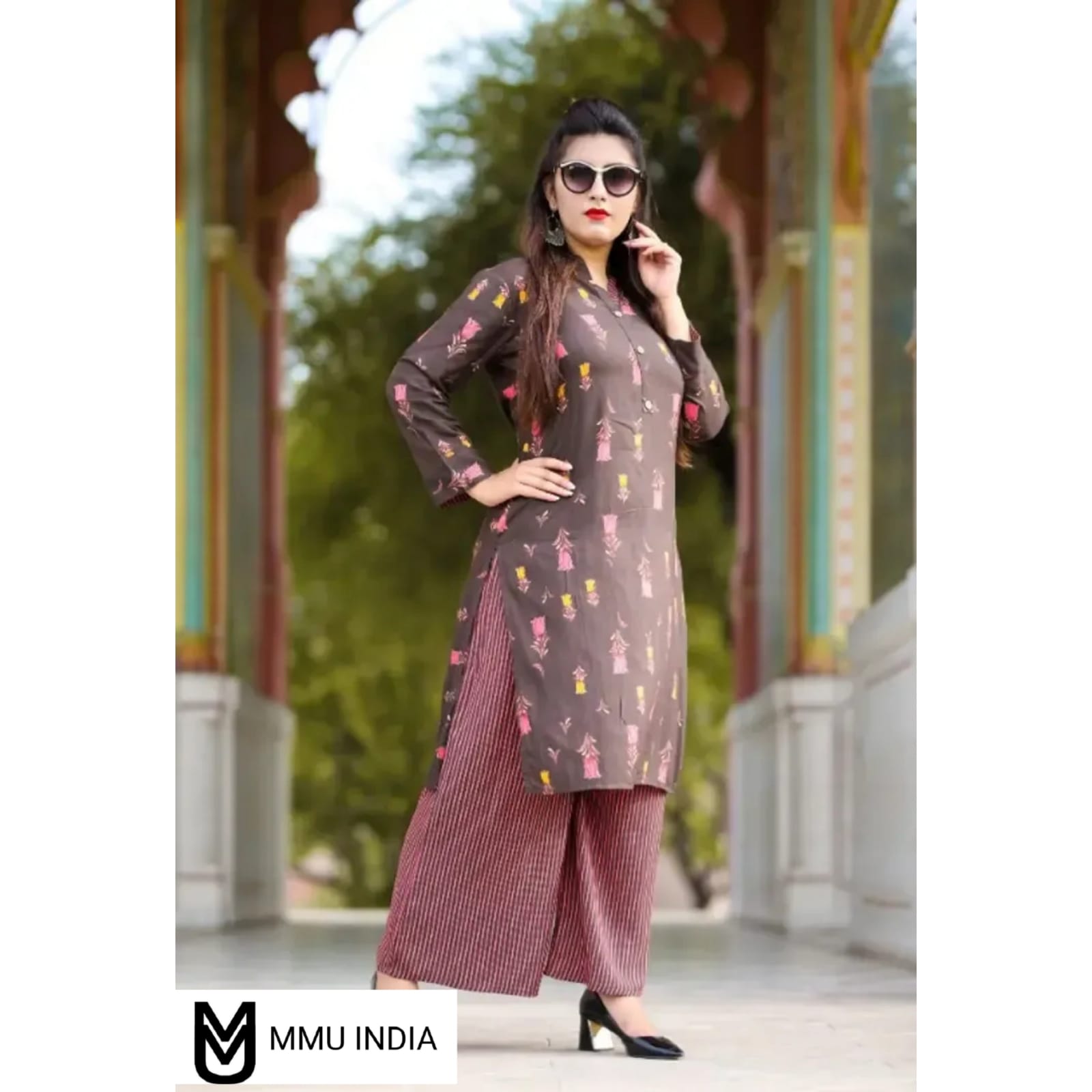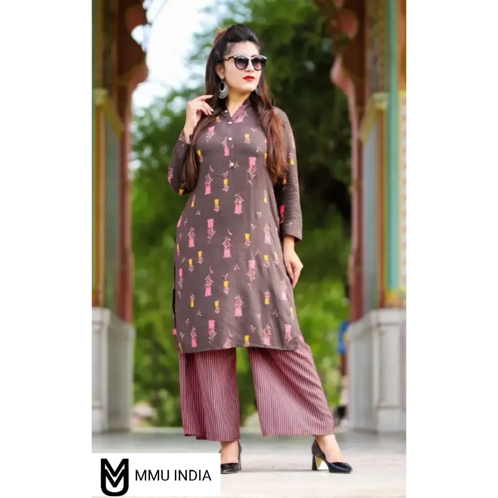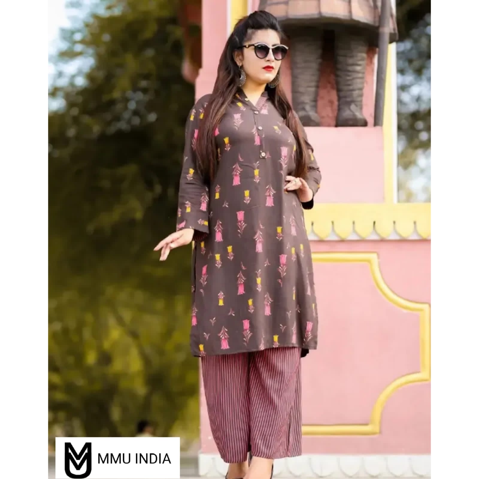 BROWN PINK PRINTED KURTI WITH LINING PRINT PLAZO SET