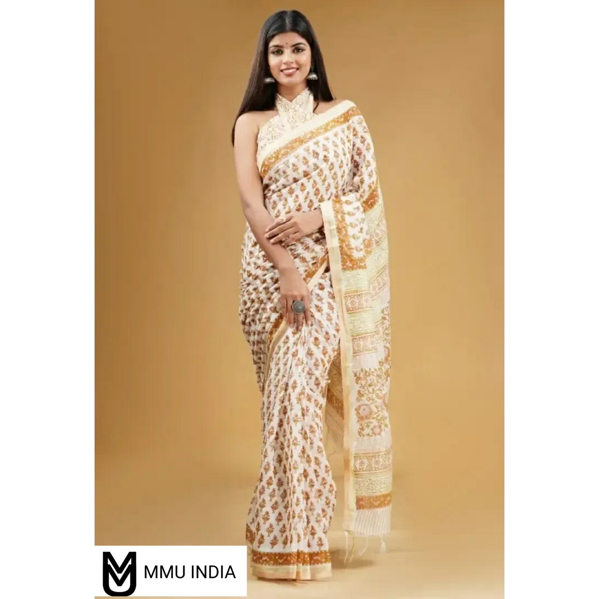 Chanderi Cotton Hand Block Printed Saree With Blouse Piece