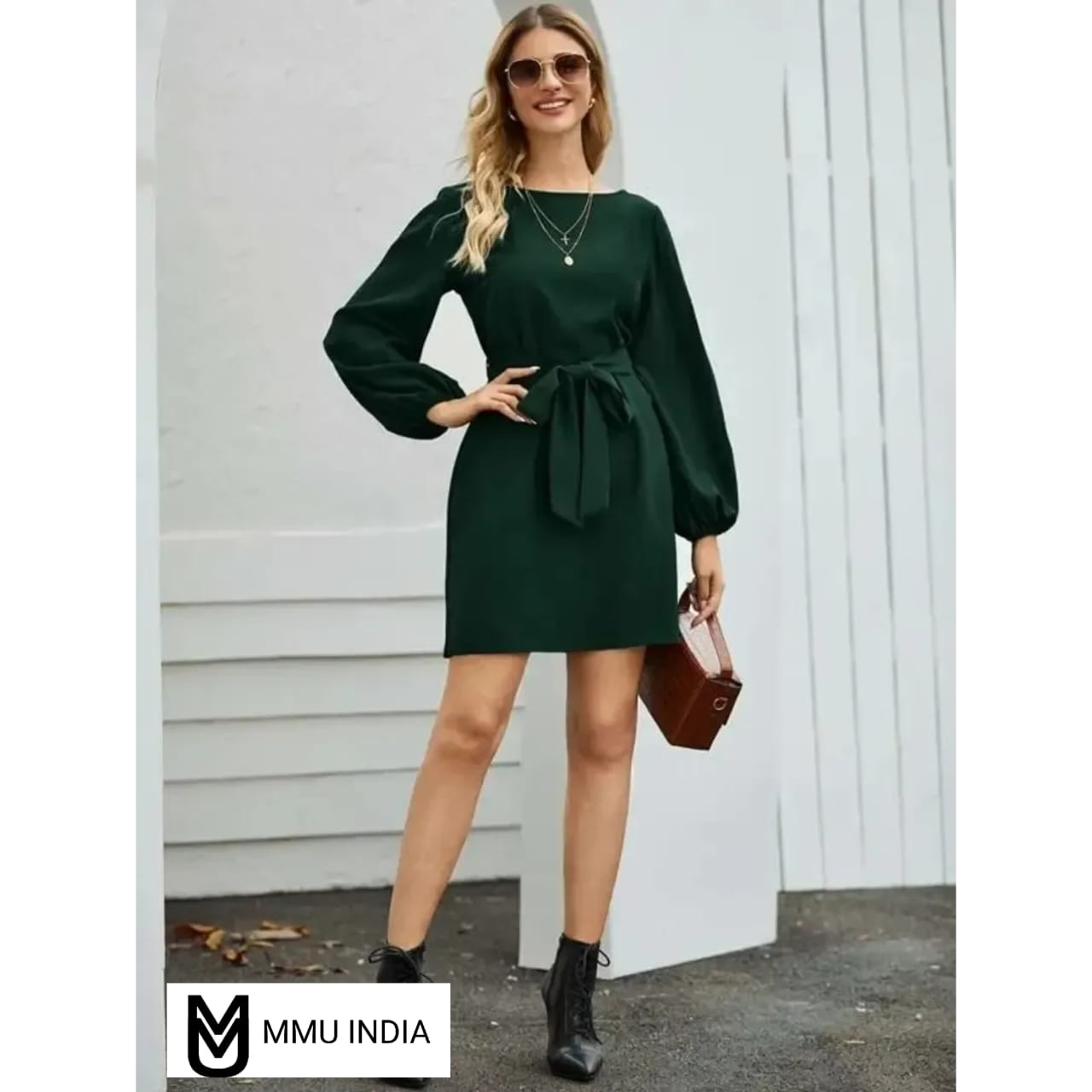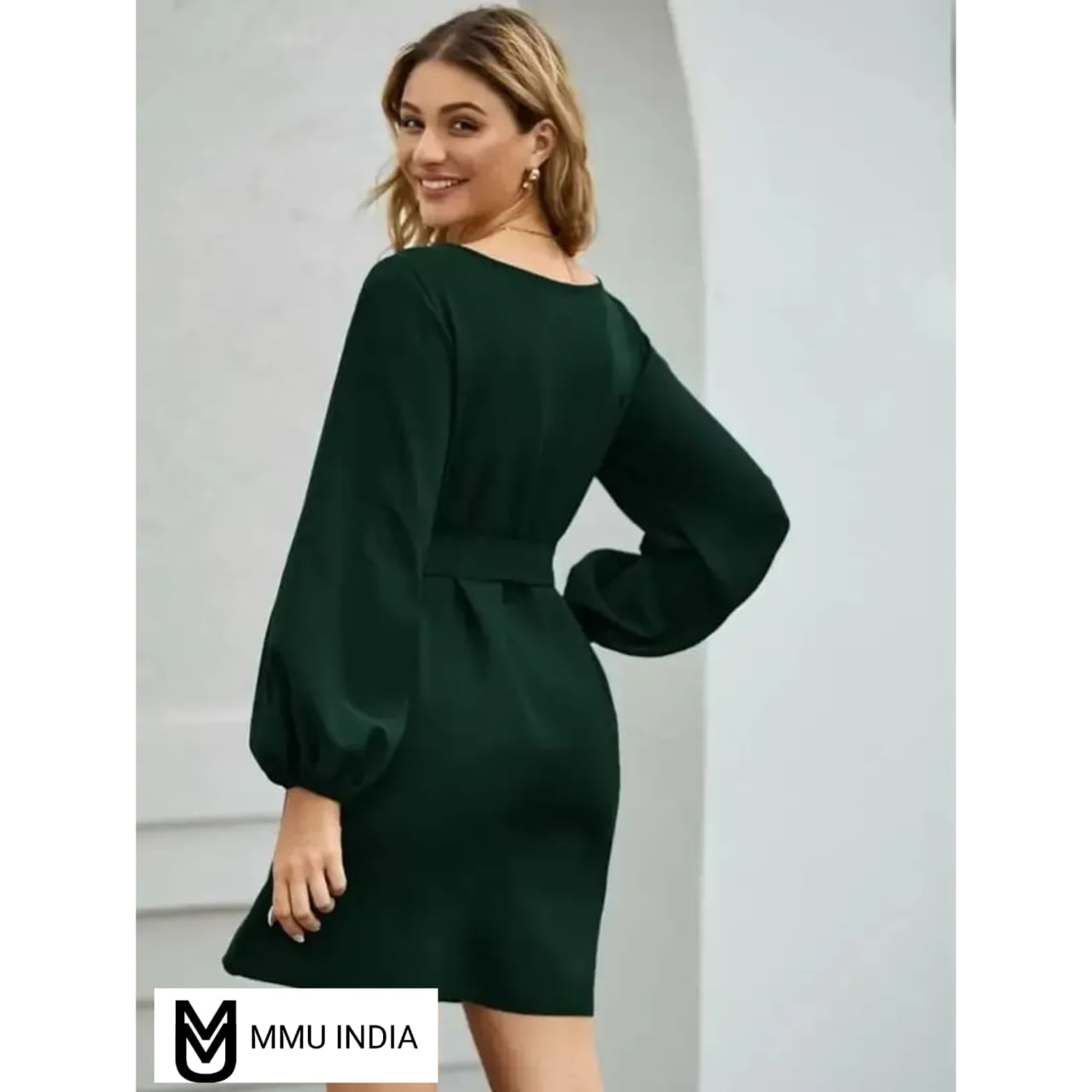 Vivient Women Elegant Dark Green Elastic Sleeve Crepe Short Dress